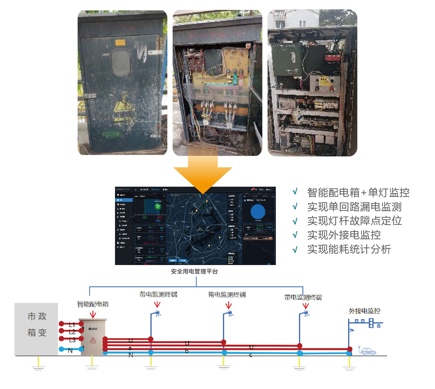 荣文科技积极响应国家推进市政基础设施设备更新的工作部署,针对市政设施(路灯)用电设施设备陈旧老化、管理方式滞后、用电安全事故频发等问题,依托自主研发的智慧用电管理平台和智能配电箱、用电边缘计算控制终端、灯杆带电单灯控制器、安全配电箱等系列化产品,多措并举为提供市政用电全场景解决方案,实现智能控制、实时监测、智能保护、能耗监控和智能运维等功能,保障市政设施及路灯用电管理智能、安全、节能、高效运行。
